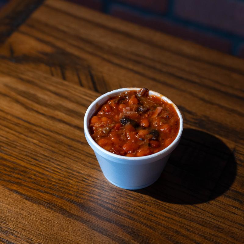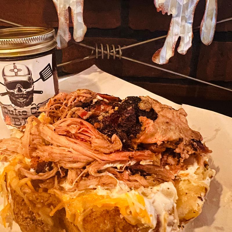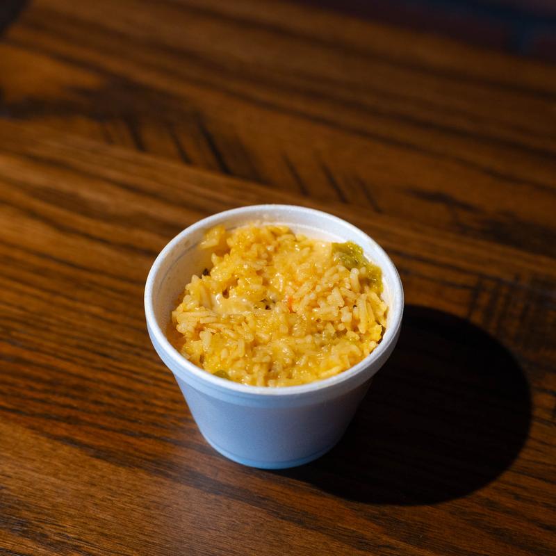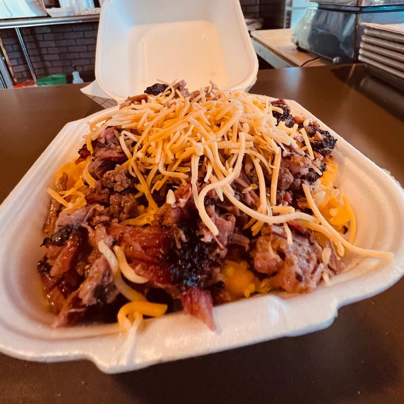 A layer of BBQ beans & green chile cheese rice, topped with your choice of meat