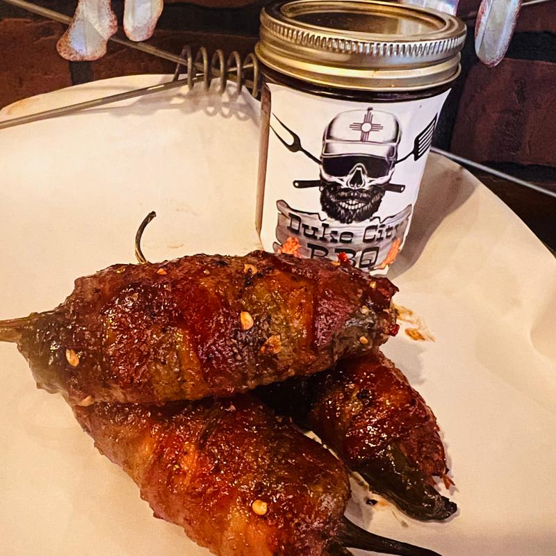 Jalapeno stuffed with cream cheese, pulled pork, wrapped with bacon